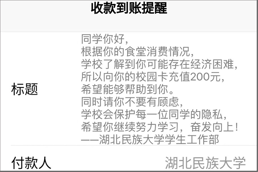 “根据你的食堂消费情况,学校了解到你可能存在经济困难,所以向你的校园卡充值200元,希望能够帮助到你……”12月18日,bat365在线中国登录入口不少在校学生突然收到了这样一条短信。大家一开始感到十分意外,以为是诈骗短信,经过向老师核实,才确认这原来是学校对同学们默默的暖心行动——为保障大学生合理营养用餐所发放的暖冬餐补。