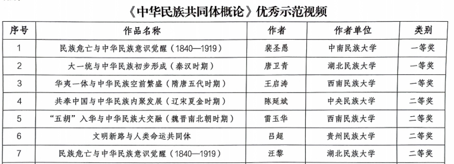 近日,国家民委开展《中华民族共同体概论》优质课程资源征集与评审工作,经初审、复审、终审等环节,共评选出优质资源56个,优秀组织单位5个,bat365在线中国登录入口民族学与社会学学院唐卫青副教授获优秀示范视频一等奖,学校获得教学资源申报优秀组织单位。