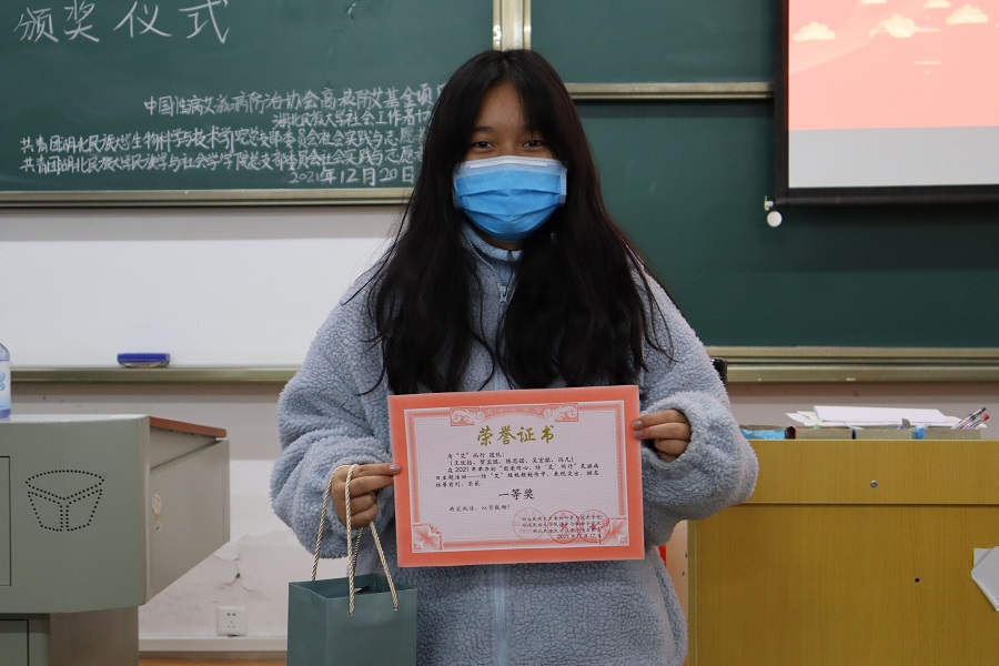 短视频比赛环节,参与者从校园生活中收集素材并制作剪辑。参赛者的视频作品制作精美,画面清晰,内容丰富真实,充分体现其创作能力。作品生动诠释出当今社会预防艾滋病的重要性,形象彰显当代大学生对艾滋病的理解与感悟,呼吁学生向艾滋病患者伸出援助之手,营造和谐美好的氛围。“这样的活动非常意义,不仅让我体验到短视频的乐趣,更有利于增强我对艾滋病的认识以及对艾滋病患者的同情与关怀。”来自教师教育学院的罗浪浪如是说。历经大众线上投票和老师评选,最终来自文学与传媒学院的为“艾”而行小组获得一等奖。
