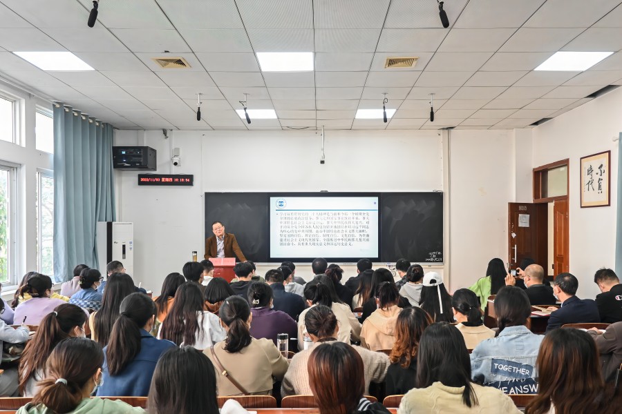 11月3日,法学院党总支在9B305教室组织开展学习党的二十大精神专题活动,学校组织员邓辉煌同志受邀担任主讲,他带领大家学习了习近平总书记在党的二十大报告中提出的新观点、新论断、新思想。法学院全体教师和学生党支部全体党员、发展对象参加了学习。