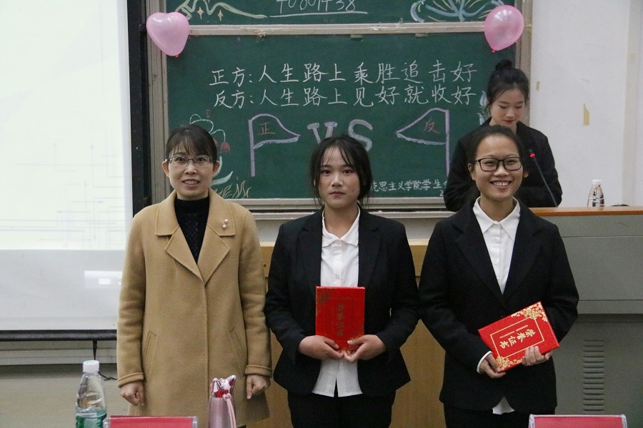 经过激烈角逐,正反双方代表队跻身决赛。本次比赛共分为开篇立论、一对一攻辩、攻辩小结、自由辩论、观众提问、总结陈词、评委点评七个环节。两方围绕“人生路上是乘胜追击好还是见好就收好”这一辩题展开激烈辩论。最终,正方代表队摘得比赛桂冠,正方三辩钱美玲、反方四辩简佳艺获得“优秀辩手”称号。