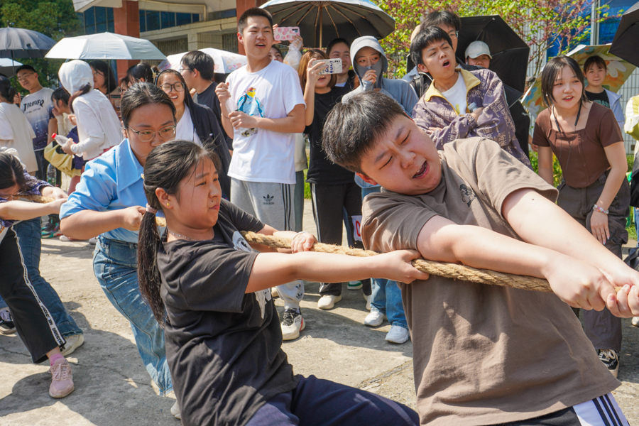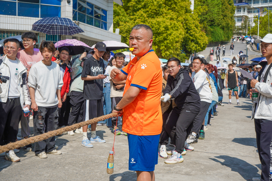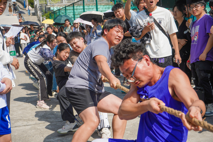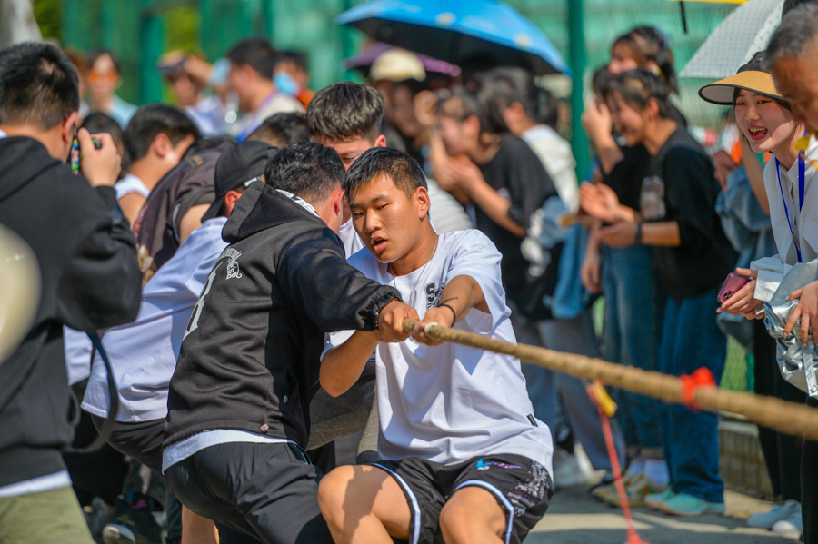 鼓声阵阵呐喊助威,4月10日上午,拔河比赛在五环田径场举行。扎好马步、勒绳下腰、降低重心,参赛队员双手紧握麻绳,全神贯注只待令声。力拔山兮,民大健儿团结齐心势不可挡。