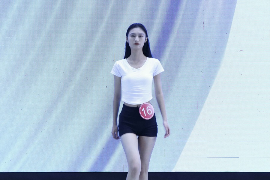 形体展示环节,选手缓慢走至台前展示体型体态,分别展示正面、侧面、背面,评委依据选手五官和形态,四肢比例以及站立与行走的姿势为选手打分。16号选手杜亚燕穿着简单利落,步伐自信流畅,尽现青春的风采。