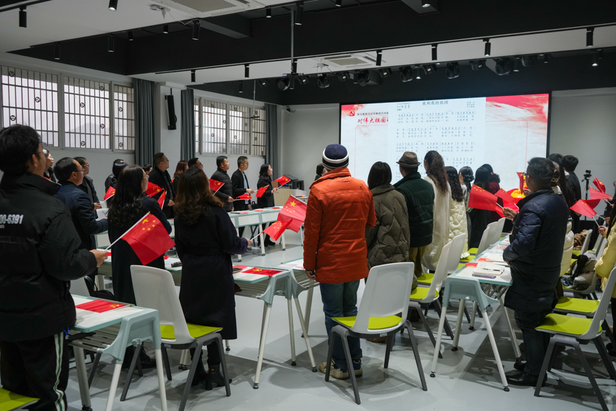 音乐舞蹈学院党总支书记张蕊领誓入党誓词。集体诵读《中国共产党章程》(第三十二条)。