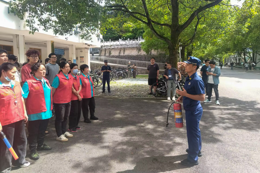 随着火灾警报声响起,学生在物业管理人员的引导下下俯身,用手帕、毛巾等捂住口鼻,沿着安全路线快速疏散,有序撤离到宿舍楼栋外安全区域。保卫工作部(处)接警后,安排应急消防队员第一时间到达现场,学院路消防站消防员到达现场开展模拟灭火演练。
