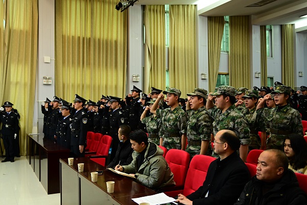 本网讯(见习记者 谭蕊 周希/文 陈璇/图)12月17日,校卫队总结表彰暨二十四届成立大会在行政楼一号会议厅举行。党委常委、副校长祝建波,学生工作部部长向政,保卫处处长郭智斌,副处长何永红,校园秩序管理科科长谢整文等出席此次大会。