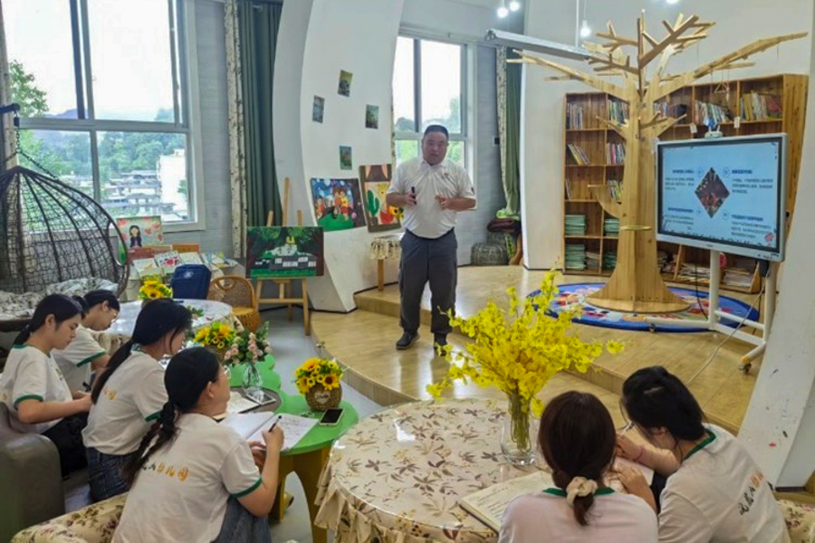 同心圆志愿队来到栖凤社区所辖的凤凰山森林幼儿园开展实践活动。王剑老师对全体幼儿园教师开展了在幼儿园小朋友中如何进行铸牢中华民族共同体意识的知识培训。团队成员和小朋友一起跳起民族舞蹈,并在幼儿园小朋友中开展调查。