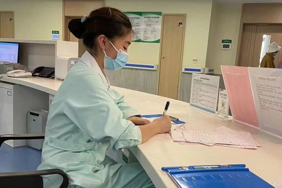 夏莉莉在护士台写工作记录