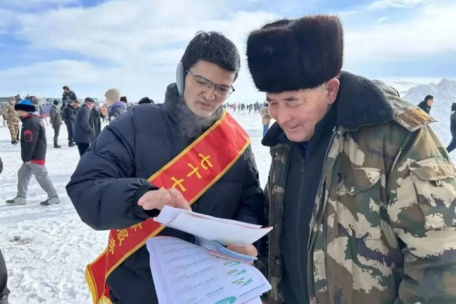 卡木力江在77团举办的“那吾热孜杯”冰雪赛马大会上开展法治宣传活动