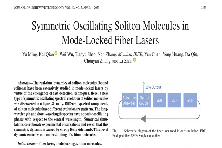 4月1日,bat365官网智能科学与工程学院光电信息科学与工程专业2021级学生明雨以第一作者身份在中国科学院一区Top期刊(2023年中国科学院文献情报中心期刊分区表)《光波技术杂志》(《Journal of Lightwave Technology》)(影响因子4.1)发表了题为《锁模光纤激光器中的对称振荡孤子分子》(“Symmetric oscillating soliton molecules in mode-locked fiber lasers”)的学术论文。