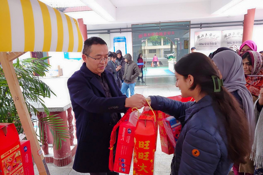 国际教育学院副院长李元胜为留学生发放春节礼品