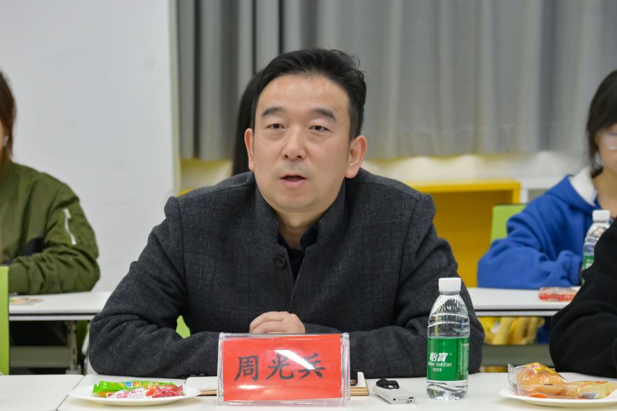 周光兵发表讲话。他在讲话中对此次交流座谈会表示期待,通过回顾自己在母校的学习、在报社的相关工作经历来感谢母校的培养,期待通过此次交流会促进两校新闻宣传工作良效发展,并鼓励双方学生在会议中尽情发言交流。