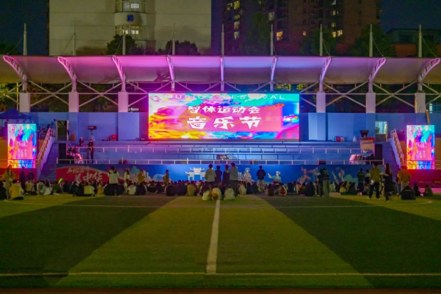 5日晚,五环体育场举办了炙能音乐节与荧光夜跑活动,灯光交织,音符跳跃,荧光闪闪。体育场内,同学们随着欢快的节拍舞动,参与荧光夜跑的老师和同学们伴随着音乐,放松奔跑,校园沉浸在欢快的旋律中。