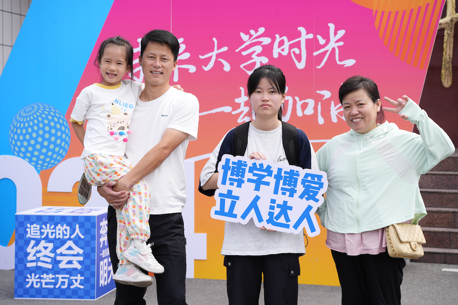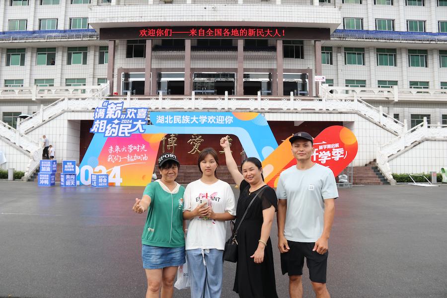 来自湖北咸宁的焦梓蕙一家人喜气洋洋站在校门口热情合影。“大女儿已经上大学,现在来送小女儿上大学”,焦梓蕙的妈妈感到非常开心,“她以前也有住校经历,我相信她能照顾好自己,过好大学生活,并且以此为起点,奔赴更广阔的天地。”焦梓蕙的妈妈十分信任女儿,相信她能在生活上独立照顾自己,并能在民大认真学习,百尺竿头更进一步,向更高远的目标努力奋斗。