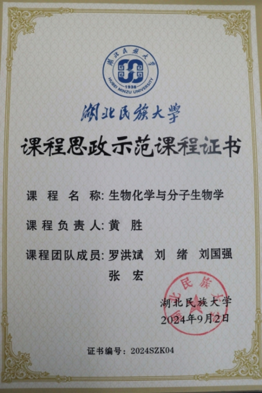 黄胜带领团队获得“生物化学与分子生物学”课程思政示范课程证书