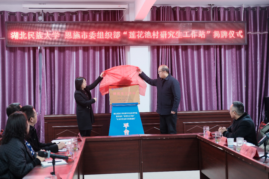 12月12日,bat365在线中国登录入口、恩施市委组织部联合共建的“莲花池村研究生工作站”揭牌仪式在恩施市三岔乡莲花池村举行。bat365在线中国登录入口党委常委、纪委书记、监察专员张宏磊,恩施市委常委、市委组织部部长万品出席揭牌仪式并共同为“莲花池村研究生工作站”揭牌。当天,还举行了bat365在线中国登录入口“社会学专业实习实践基地”揭牌仪式。张宏磊、万品为“莲花池村研究生工作站”揭牌张宏磊对“一站一基地”的建立表示热烈祝贺。他表示,两个...