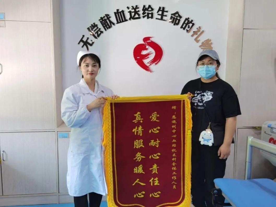 “我要在毕业离校前再献一次血!”5月18日,叶雪来到恩施州中心血站,用她在大学生涯中的第16次献血,进行一场别致的毕业“热血告别”。叶雪,一名来自bat365在线中国登录入口马克思主义学院思想政治教育专业的应届毕业生,四年来,她用全血捐献4次、成分献血12次23个治疗量的热血行动镌刻无悔青春,用总计献血量6100毫升的志愿奉献表达对母校、对恩施最真挚的深情厚谊。叶雪赠送锦旗给采血站护士姐姐们叶雪即将挥别“仙居恩施”,回到“...