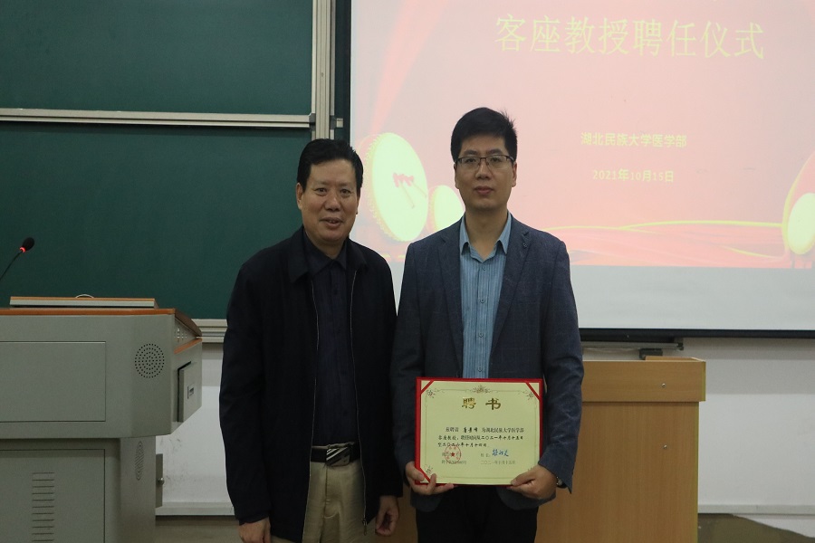 本网讯(通讯员 袁子涵 许旖蕾/文 夏雪花/图)10月15日,湖北工业大学生物工程与食品学院副院长、生物医药研究院院长唐景峰教授受邀到医学部开展学术讲座。党委副书记、副校长汪兴平为为唐景峰颁发“客座教授”特聘证书,医学部、风湿病重点实验室等老师及医学部100余名研究生、本科生参加本次讲座。讲座由医学部常务副主任罗洪斌主持。汪兴平(左)为唐景峰(右)颁发客座教授特聘证书讲座伊始,罗洪斌向大家介绍唐景峰教授,...