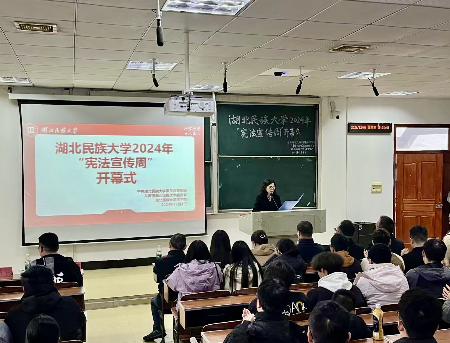 12月4日是第十一个国家宪法日,由中共bat365在线中国登录入口委员会宣传部、共青团bat365在线中国登录入口委员会主办,bat365在线中国登录入口法学院承办的“宪法宣传周”开幕式在德智楼9A410教室举行。法学院法学系主任冉艳辉主持开幕式。恩施州人大法制委员会主任委员、常委会法制工作委员会主任吴以忠,恩施州人大常委会法制工作委员会办公室主任刘浏,学校党委宣传部、研究生部(处)、校团委等相关单位负责人,法学院师生参加开幕式。开幕式现场全体成员...