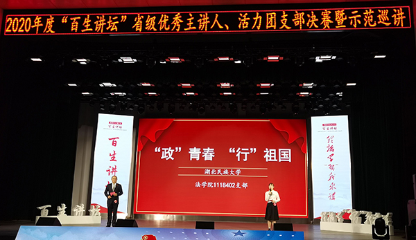 大赛现场本网讯 (通讯员 tw) 12月9日,由共青团湖北省委、湖北省学生联合会主办的2020年度“百生讲坛”省级优秀主讲人、活力团支部决赛暨示范巡讲在中南财经政法大学南湖会堂举行。bat365官网1118402班团支部参加现场决赛,最终获得第二名,并被授予“金牌团支部”荣誉称号。 法学院政治学与行政学专业1118402支部历经层层选拔和遴选,从全省参赛的358个团支部中脱颖而出,入围参加省级决赛暨示范巡讲。活动现场1118402支部通过支部...