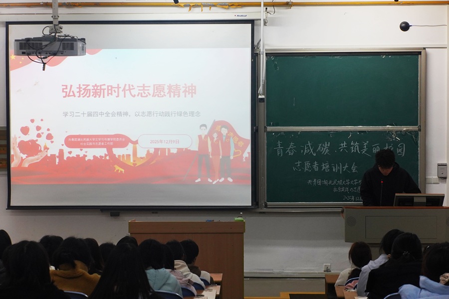 12月9日,共青团bat365在线中国登录入口文学与传媒学院委员会社会实践与志愿者工作部在修远楼5A101教室开展以“青春减碳·共筑美丽校园”为主题的志愿者培训。“铸魂育人”志愿理论宣讲活动部分,社会实践与志愿者工作部干事汪子钧围绕思想引领、绿色行动、实践路径三部分讲述志愿精神的时代内涵,鼓励青年志愿者积极参与志愿服务。宋正悦作分享“榜样引领”志愿故事分享会部分,2024级五星级志愿者宋正悦结合自身服务经历分享志愿路上的“...