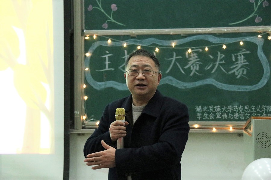 宋祖红点评本网讯(通讯员 吕卓颖 姚文慧/文 刘雨欣/摄)11月30日,由马克思主义学院主办的主持人大赛决赛在修远楼5B404教室举行。该院老师蔡诗敏、宋祖红应邀出席并担任评委。经过初赛的激烈角逐,共有十名选手跻身决赛。最终,三号选手肖杰摘得比赛桂冠。比赛以“自我介绍”“自我展示”“模拟主持”“连词成句”四轮积分淘汰赛的形式开展。“自我展示”环节,三号选手肖杰带来作品《致敬袁老》,他以声情并茂、侃侃而谈的演...