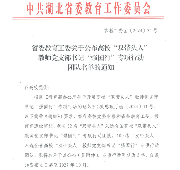 近日,中共湖北省委教育工委公布了高校“双带头人”教师党支部书记“强国行”专项行动团队名单,bat365官网马克思主义学院思想政治教育系党支部书记蔡诗敏入选全国高校“双带头人”教师党支部书记“强国行”专项行动团队,数学与统计学院教师党支部书记王清龙入选全省高校“双带头人”教师党支部书记“强国行”专项行动团队