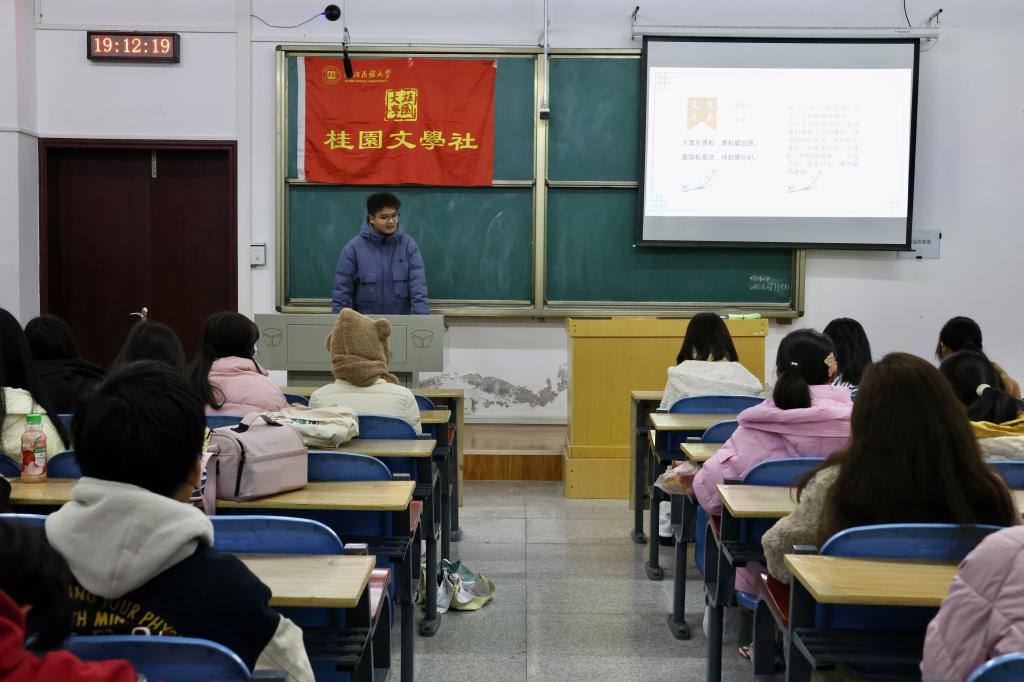 11月30日,桂园文学社在修远楼5A103教室举办以“冬日话苑”为主题的活动,文学社成员畅所欲言,各抒己见,进行思想的碰撞与交流,感受冬季与文学相结合的独特魅力。活动现场本次活动主要分为冬日文化分享、互动交流、故事分享三个部分。冬日文化分享环节,桂园文学社社长王萌从“生活中的冬天”“诗词里的冬天”和“文学作品中的冬天”三个方面引经据典向观众介绍中国的冬日文化。互动交流环节,成员们充分调动所学知识,分享自...