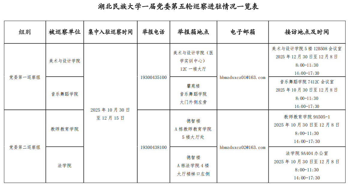 根据学校党委统一部署,一届党委第五轮巡察于10月30日完成正式进驻。本轮巡察组建2个巡察组,采取“一托二”的方式,对美术与设计学院党总支、音乐舞蹈学院党总支、法学院党总支、教师教育学院党总支等4个院级党总支开展政治巡察。
