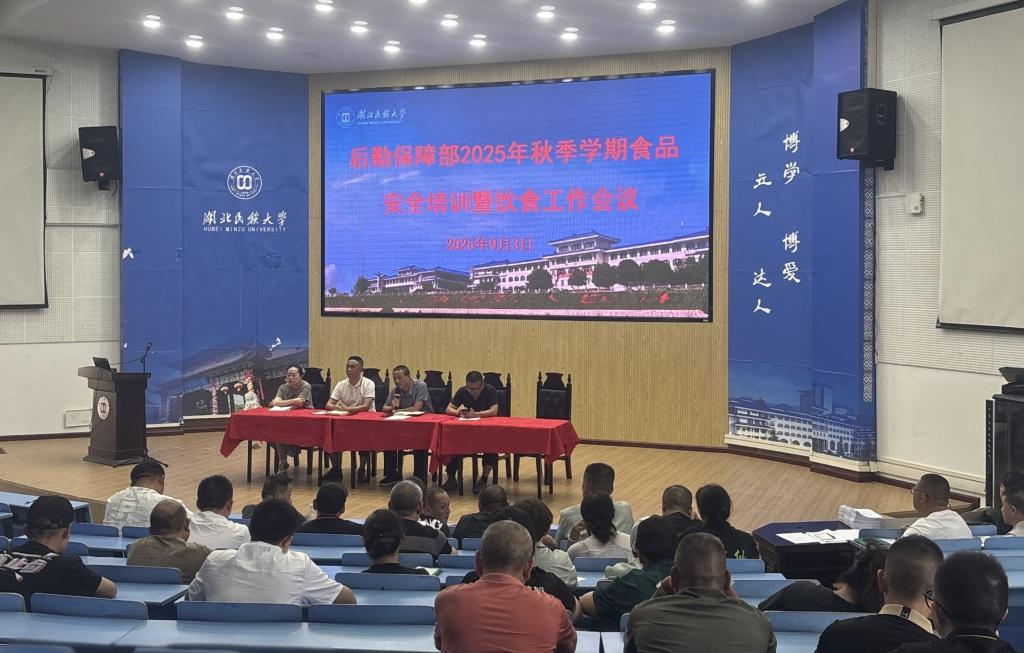9月3日下午,后勤保障部2025年秋季学期安全培训暨饮食工作会议在图书馆多功能报告厅召开。恩施市市场监督管理局舞阳所副所长胡成学应邀出席本次会议并授课,饮食服务中心全体工作人员、各食堂经营单位负责人及全体从业人员等参加本次会议。会议由后勤保障部副主任高波涛主持。
