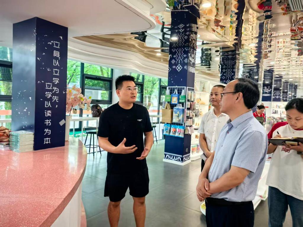 走进倍阅书店,田景福听取负责人关于书店经营情况的介绍,了解实体书店为学生提供自习场所、助力各单位开展文化活动的相关情况,参观了书店与学校共创的文创品展示区。