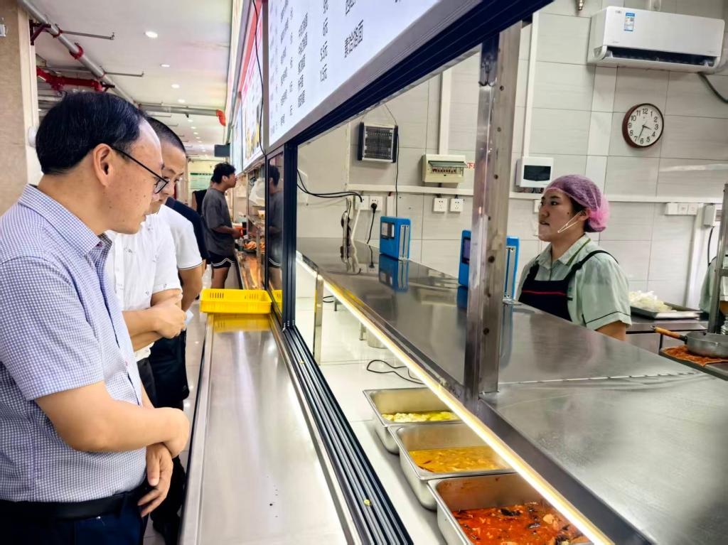 在学生食堂,田景福深入后厨,查看食品加工、烹饪、备餐、洗消情况,询问经营户及食堂管理人员,详细了解食堂运营模式、营业时间、菜品供应、经营状况等情况。