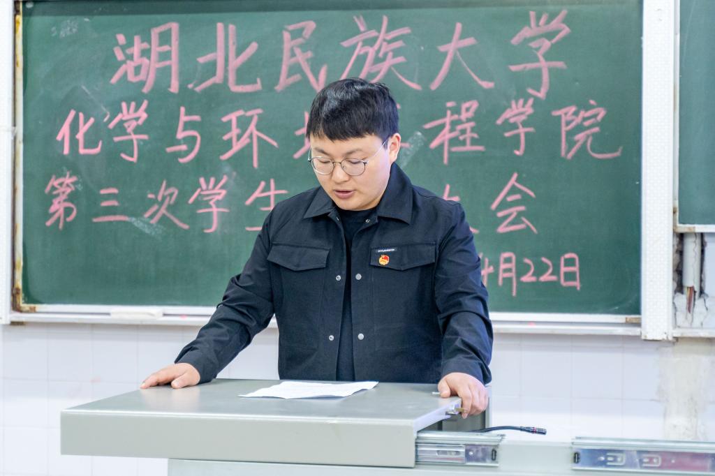 校团委社会实践与志愿者工作部副主任雷鹏发言,他代表校学生会向我院学生会对其工作的支持表示感谢,并向本次大会的召开表示祝贺。他谈到:学生会同学应坚定理想信念,牢记“博学、博爱、立人、达人”的校训和“艰苦奋斗、甘于奉献、自强不息、追求卓越”的民大精神,全面发展,努力成长为堪当民族复兴重任的青少年。