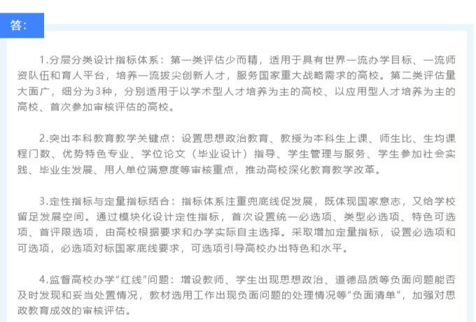 三是坚持分类指导。适应高等教育多样化发展需求,依据不同层次不同类型高校办学定 位、培养目标、教育教学水平和质量保障体系建设情况,实施分类评价、精准评价,引导和激 励高校各展所长、特色发展。