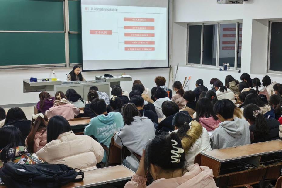我院本科学生党支部书记张艺馨以“为中华民族复兴书写青春答卷”为主题,从“认识我国的民族政策”“听故事学楷模”“如何维护民族团结”三个方面进行第五次授课暨民族团结教育,除青马工程培训班学员外,我院全体新疆籍和西藏籍学生也参与了此次授课。她分别从“四个共同”“五个认同”“三个离不开”“六个好”这些角度阐述我国的民族政策,并分享感动新疆十大人物王燕娜和感动中国人物艾尼·居买尔的先进事迹,让在座学生学习他们的坚韧担当和为民族团结贡献力量的奉献精神。此外,张艺馨着重讲解“西部计划”的保障政策和招募流程,加强在座学生对西部计划的认识与了解,鼓励大家积极投身到祖国的西部地区建设事业中去,树立中华民族多元一体格局,高举中华民族大团结的旗帜,力争将青春的热血信仰熔铸成基层建设的坚实依靠。