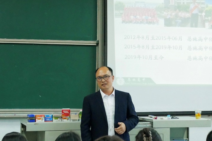 杨家勇老师以“充实美好大学生活,助力崭新的教书生涯” 为题,从“个人工作经历”、“王国维的人生三重境”、“如何当好一名新教师”、“享受快乐的教师生活”四个方面进行讲述。他认为只要奋斗,一切皆有可能,并从个人工作经历出发,分享了自己从求学到成为恩施高中化学教科室主任这一段漫长的经历。接着,他以王国维的三重人生境界来表明自己对化学专业学生的希望,杨家勇老师认为大学是人生的起跑线,进入大学后要强健体魄,并举出自己所带的一位高位截瘫学生考上西北工业大学的案例诠释“衣带渐宽终不悔,为伊消得人憔悴”的现实意义。杨家勇老师还重点讲述了如何当好一名新教师,他希望同学们认清自身的优势和短板,牢记好教师的基本要求,勇担重任,树立终身学习的理念,学会及时总结与反思,在备课时做到“二研”和“五个关注”,在上课时要做到心中有框架,有思路,有想法。最后,杨家勇老师表示自己很享受教师生活,这里有他爱的学生和学生对他的爱,有志同道合的同事,有展示才能的平台。讲座结束后,进行了现场问答环节,杨家勇老师结合自身成长经历,用教学实例对所提问题进行回答。