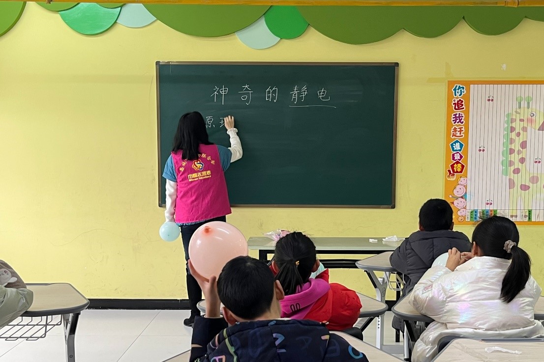 本次志愿活动分为“神奇的静电”“膨胀的气球”和“唱生僻字”三个环节。活动伊始,社长将参加的小朋友聚集在一个教室里做相关准备工作。在“神奇的静电”实验环节,志愿者先从身边的实例引出静电这一概念,并且亲自给小朋友们示范实验流程。稍后,在小朋友们自己动手时,发现气球可以将小纸屑吸附起来,志愿者为他们解释这是因为每个物体所带的电荷不同,电荷差会吸引附近的物体产生静电。接着,在“膨胀的气球”实验中,志愿者提出问题:如何在不使用外力的情况下使气球膨胀,小朋友积极思考,踊跃发言。志愿者肯定小朋友的回答后,将白醋和小苏打倒入瓶子里,气球套在瓶口上,在一瞬间两种物质发生反应产生气体,气球迅速膨胀起来,小朋友都发出惊呼并十分兴奋。实验结束后,志愿者为小朋友科普小苏打的用处及其反应条件。最后,志愿者带着小朋友们唱歌曲生僻字,鼓励小朋友们积极观察生活中的点点滴滴,并且布置相关实验作业。