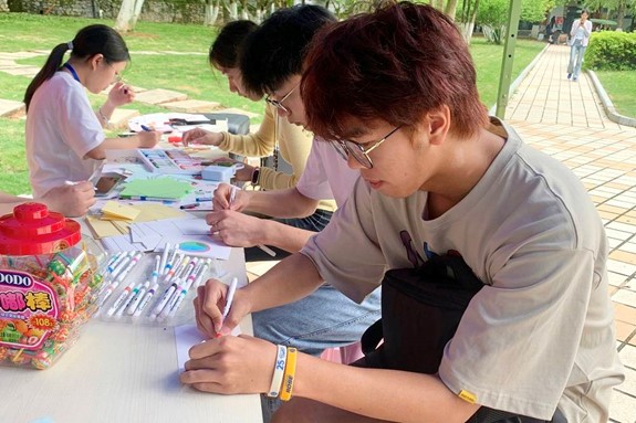 本次活动由主题班会、书写展板和线下活动三部分组成。四月是心理健康月,特以此为契机,开展心理健康主题班会,普及心理健康相关知识,从而加强学生对心理健康的认识和关注,有效预防心理疾病。同时,工作人员提前一周在学院门口准备展板,学生在上面可以尽情书画,将心情用笔墨表达出来,小小一块展板,容纳心绪万千。线下心理健康活动分为“丢沙包”“微笑计划”“分享箱与宣泄箱”三个游戏环节。“分享箱与宣泄箱”环节更是成为学生倾诉心声、释放压力的港湾。在这里,他们分享快乐,撕碎烦恼,让心灵在放松的环境中得到疗愈。