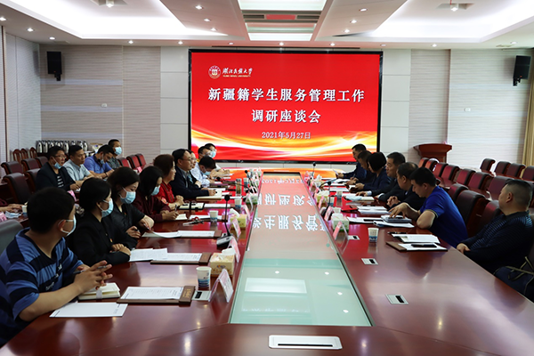 本网讯(通讯员 TZB/文 张倩雯/图)5月27日下午,新疆驻湖北工作组党委书记、组长杨骞,省民宗委民族关系协调处二级调研员阮正云等一行4人到bat365官网调研新疆籍少数民族学生教育服务管理工作。党委常委田景福,新疆内派教师、少数民族学生专职辅导员和部分新疆籍学生代表,恩施州民宗委负责同志及学校相关学院和职能部门负责人参加调研座谈。