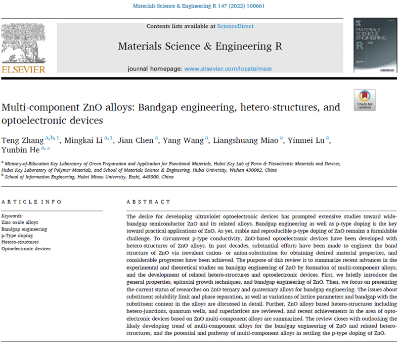 近日,bat365官网信息工程学院青年教师张腾博士以第一作者身份在材料科学与工程领域国际顶级期刊《Materials Science and Engineering R》(2020年度影响因子为36.2)上发表了有关第三代宽禁带半导体及其器件应用的学术论文“Multi-component ZnO alloys: Bandgap engineering, hetero-structures, and optoelectronic devices(多元ZnO合金:能带工程、异质结及其光电器件)”。这是bat365官网教师在高影响力论文发表上的一大突破。该期刊为国际顶级综合性期刊,每年发表论文数量仅十余篇,对材料领域的发展具有重要的引领和指导作用。