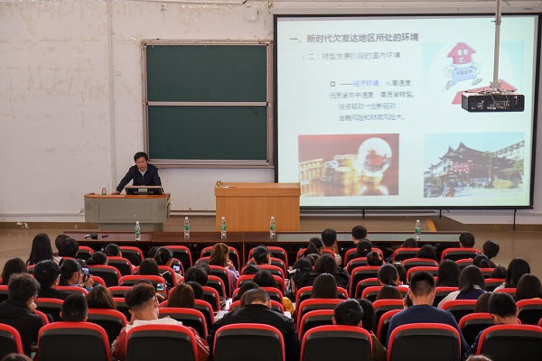 蓝海涛围绕“新时代欠发达地区所处的环境”“欠发达地区追赶发展的竞争优势和劣势”“追赶发展中的东北地区塌陷教训”“对策建议”四个方面展开讲座。他以复杂多变的国际政治经济环境和转型发展阶段的国内环境为例,详细阐述经济环境、社会环境、技术环境、生态环境对经济发展的影响;同时,他结合欠发达地区经济发展“难”和“辛”的实际情况,指出思想观念保守、科学精神不足、人力资本短缺、公共产品短缺是其目前的劣势。在讲座中,他通过分析东北地区经济发展塌陷事例,强调转换观念、增强能力、降低风险、提升动力等策略对于欠发达地区追赶发展经济尤为重要。