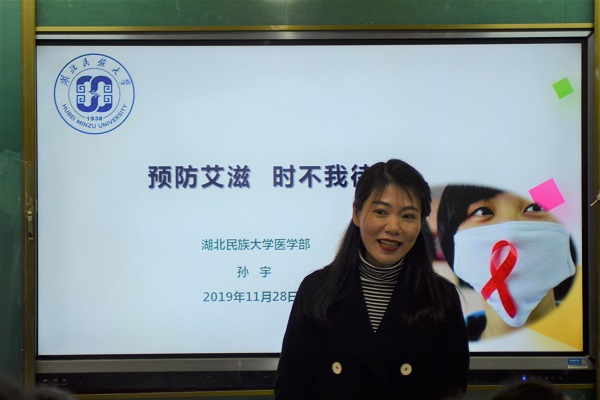 随后,医学部孙宇老师为在场学生普及健康知识。他介绍了艾滋病的患病原因、传播途径及如何正确对待艾滋病患者。