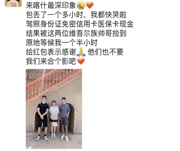 2020年6月11日下午,一名游客因沉醉于美景,将随身携带的手提包遗忘在新疆喀什旅游景点角落。手提包里含身份证、免密信用卡、现金等价值上万元的贵重物品。我院2018级财务管理专业学生麦吾兰江·麦麦提在赏景途中捡到手提包,与好友在原地等待一个多小时。他在等待到回去寻包的游客后,及时归还失物,并婉拒游客的红包。