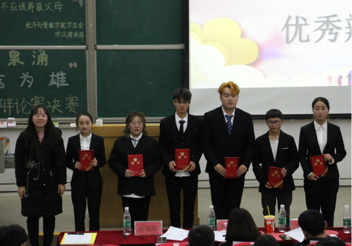 本网讯(记者 谭彰 见习记者 马骏 俞静/文 记者 苏曈/图)为培养创新和团队精神,提高思辨能力,2020年11月19日,经济与管理学院以“思如泉涌 孰言为雄”为主题的迎新杯辩论赛决赛在修远楼5A207教室举行。法学院李华霖老师,经济与管理学院团总支书记张典老师,20级辅导员解丽娟老师,19级会计专业班主任覃稣舒老师应邀出席并担任比赛评委。