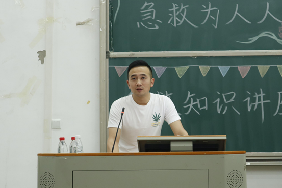 谭靖围绕心肺复苏术、溺水现场急救、创伤现场急救原则、外伤与出血的现场急救四个方面展开讲解。在心肺复苏术讲解过程中,他以院内心脏骤停和院外心脏骤停生存链为切入点,介绍心肺复苏具体操作流程。同时,他通过PPT图片展示和现场教学相结合的方式,讲解胸外心脏按压位置,演示相关应急手势;在创伤现场急救原则讲解过程中,他以局部伤、穿刺伤、鼻出血三种类型创伤为例,阐述止血基本原则和具体步骤,防止学生盲目使用消毒水和各类止血药物。