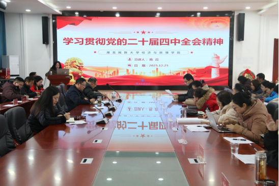 本网讯(记者 郭佳 见习记者 李晨雪/文 记者 王朝军/图)2025年12月25日,为深入学习贯彻党的二十届四中全会精神,进一步统一思想、凝心铸魂,经济与管理学院学习贯彻党的二十届四中全会精神宣讲报告会在经管楼附303会议室举行。经济与管理学院党委书记陈霞担任宣讲人,学院院长张新平主持会议,学院全体教职工参加报告会。