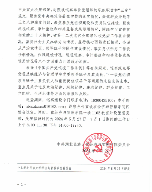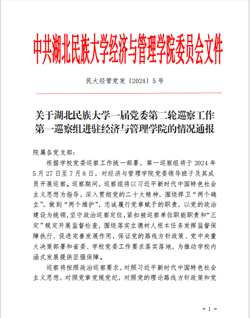 关于bat365在线中国登录入口一届党委第二轮巡察工作第一巡察组进驻经济与管理学院的情况通报