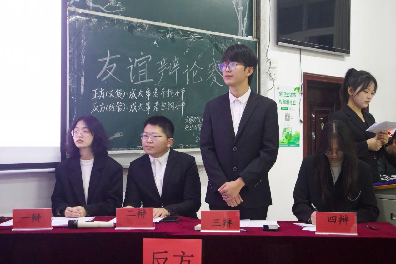 本网讯(见习记者 李如意 叶梦真 余佳怡/文 记者 张玉婷 见习记者 肖雅轩/图)为提高学生的思辨能力和语言表达能力,培养团队合作精神,切实加强校园文化建设。2023年12月15日,经济与管理学院联合文学与传媒学院举办的友谊辩论赛在文瀚楼附102教室举行。文学与传媒学院优秀辩手王珮伊、张秋瑞,经济与管理学院优秀辩手杨丽君、杨兆佳应邀出席本次比赛并担任评委。