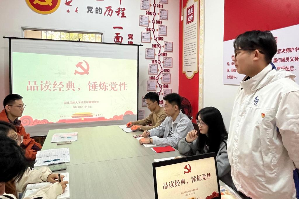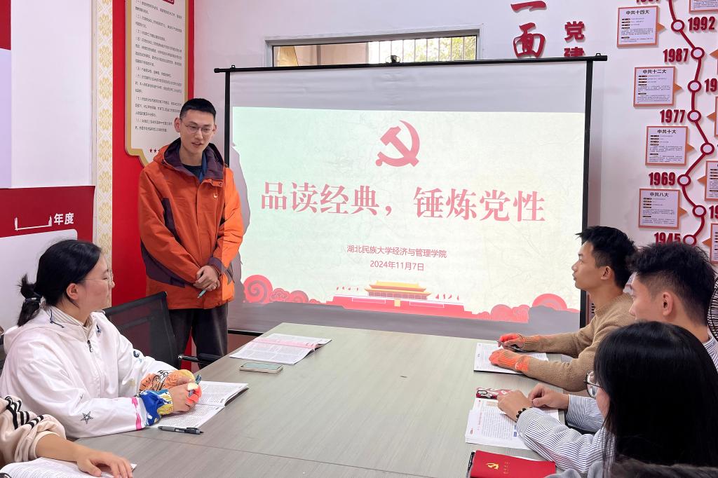 本网讯(记者 黄国轩/文 覃雨/图)为加强学习型党组织建设,倡导学生党员自觉养成爱读书、读好书、善读书的好习惯,从书籍中汲取知识、充盈智慧,进一步提升综合素养,2024年11月7日,经济与管理学院学生党支部在“一站式”学生社区-春雨社区开展“品读经典,锤炼党性”读书分享会。