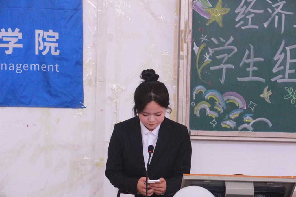 学生会代表张甜发言。她通过对自身过去工作经历的回顾与反思,呼吁新一届学生会成员传承责任担当,坚定理想信念,在工作中积极面对困难、勇敢迎接挑战,以务实行动丰富学生校园活动。